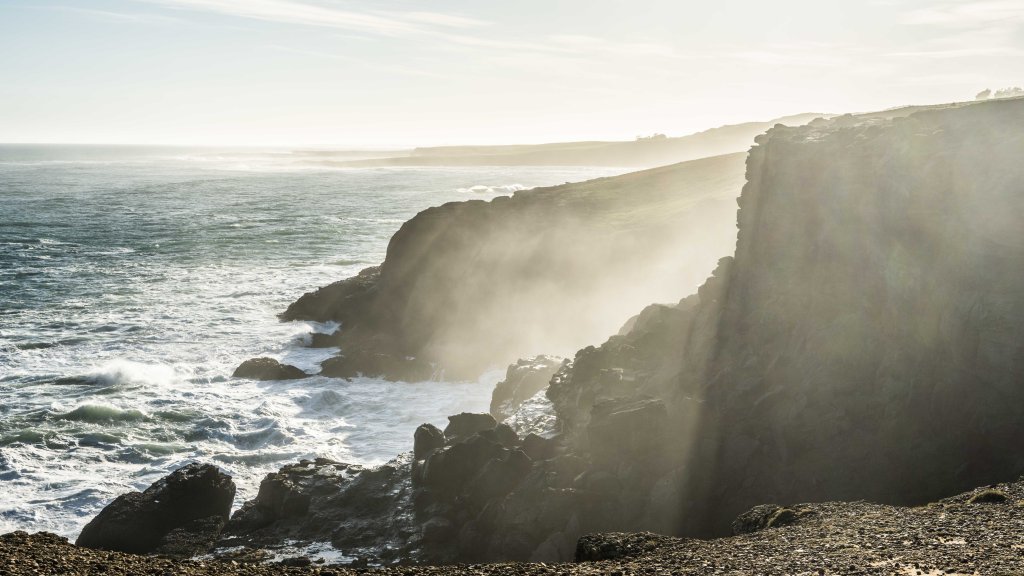 The green fields ran directly off the ocean cliffs, since any attempt to fence the property line would be swept away by the actively eroding coastline.